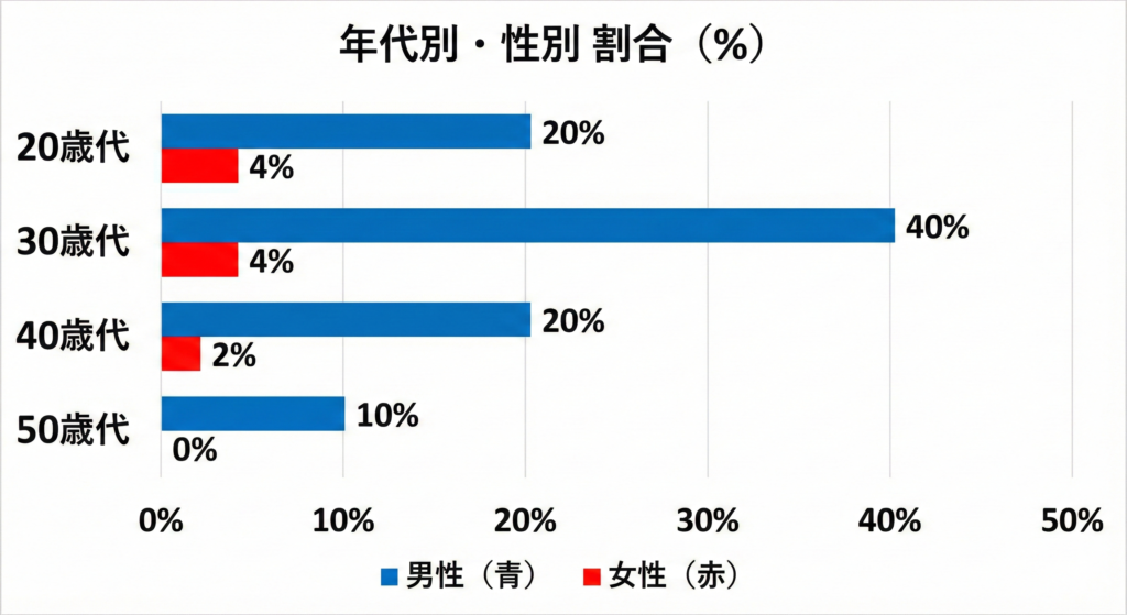 まとめると、先払い買取サービス利用者の性別傾向は男性優位(おおむね男性:女性=9:1)と考えられます。女性の利用も一定数ありますが、違法業者側も返済能力や取立てのしやすさから男性顧客を主なターゲットにしている可能性があります。