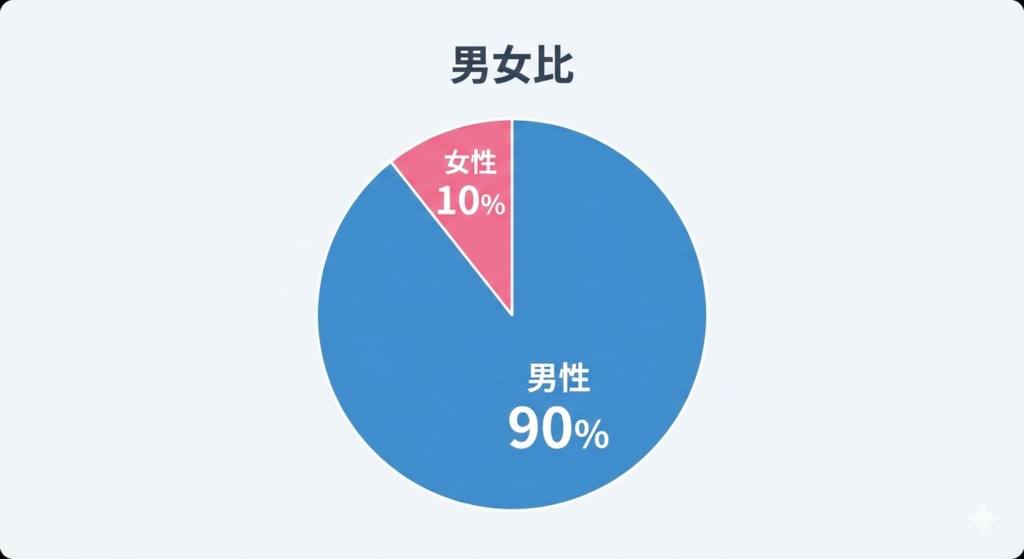 先払い買取サービスの利用者は男性の比率が非常に高いことが、複数の情報源から明らかになっています。闇金相談を受ける専門家のブログによれば、「相談者の男女比は男性が全体の9割近くを占める」状況とされ、女性からの相談はあるものの圧倒的に男性利用者が多いと報告されています。下図はこうした報告をもとに作成したイメージですが、男性が約9割を占める偏った比率になっていることが分かります。