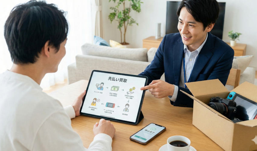 イラスト挿入:ここに「先払い買取の仕組み」を説明する図(利用者が商品を売却して現金を先に受け取り、後から商品を渡す流れのイメージ)が入ります。